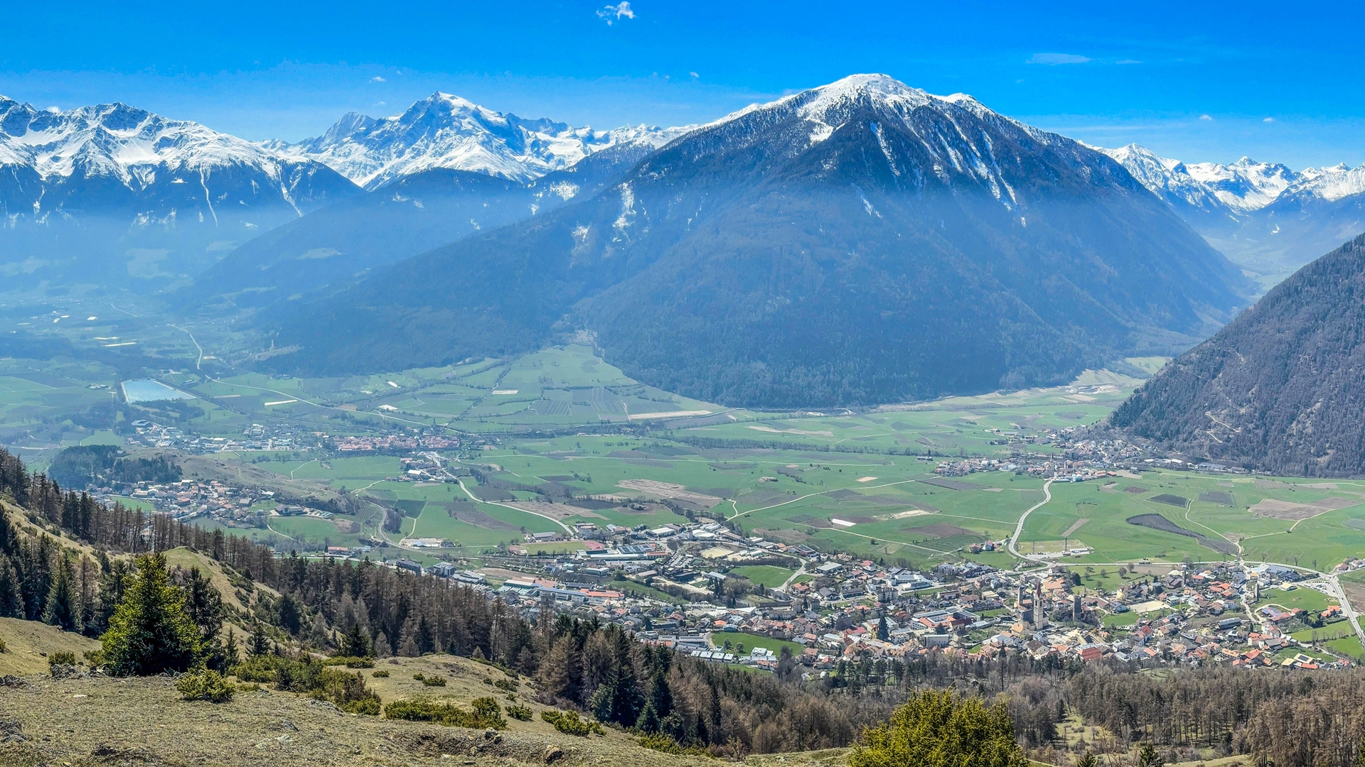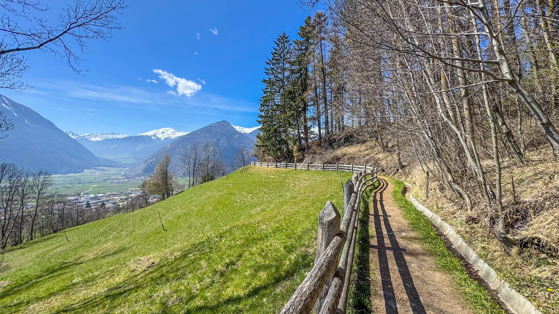 Der Weg führt uns durch lichte Wälder und über sonnige Lichtungen, die immer wieder den Blick auf das spektakuläre Massiv des Ortlers freigeben. Du hast den höchsten Berg Südtirols also immer im Visier, während wir gemütlich unsere Bahnen ziehen.