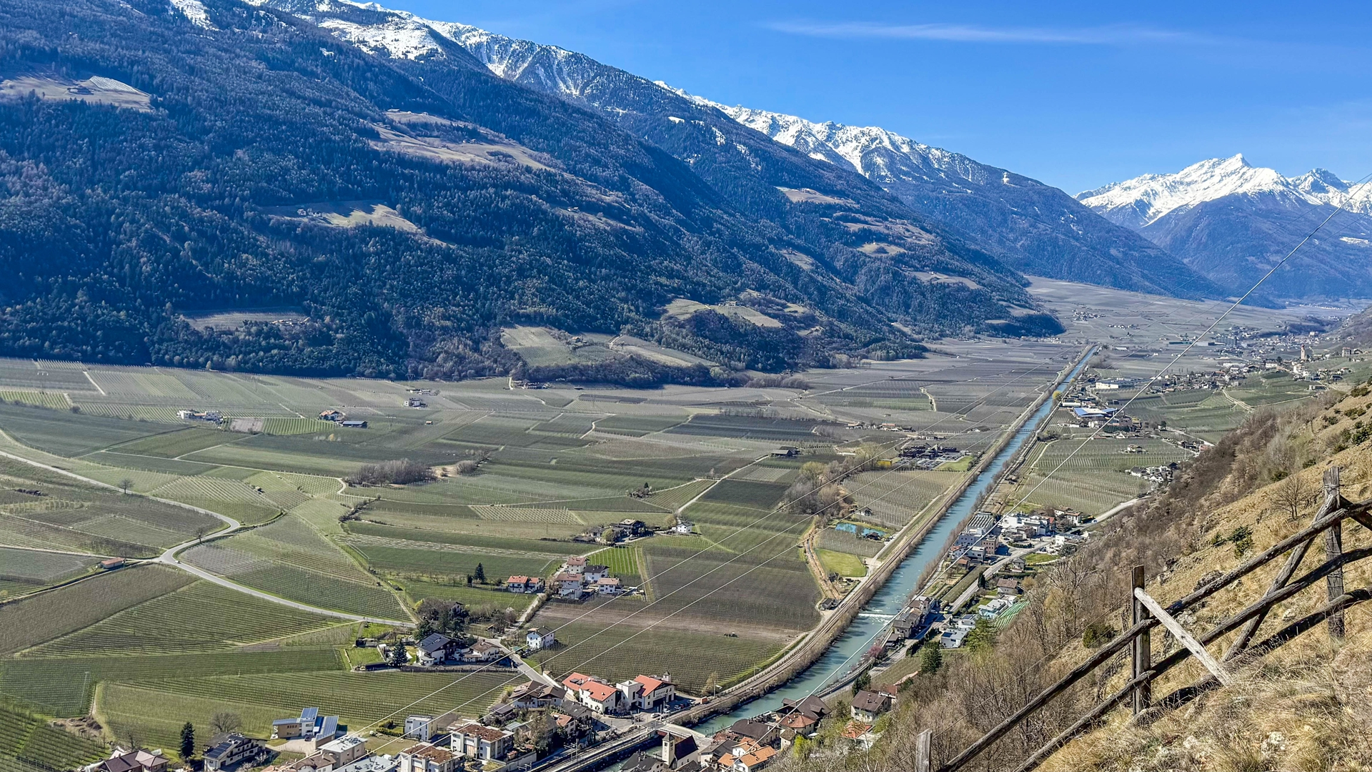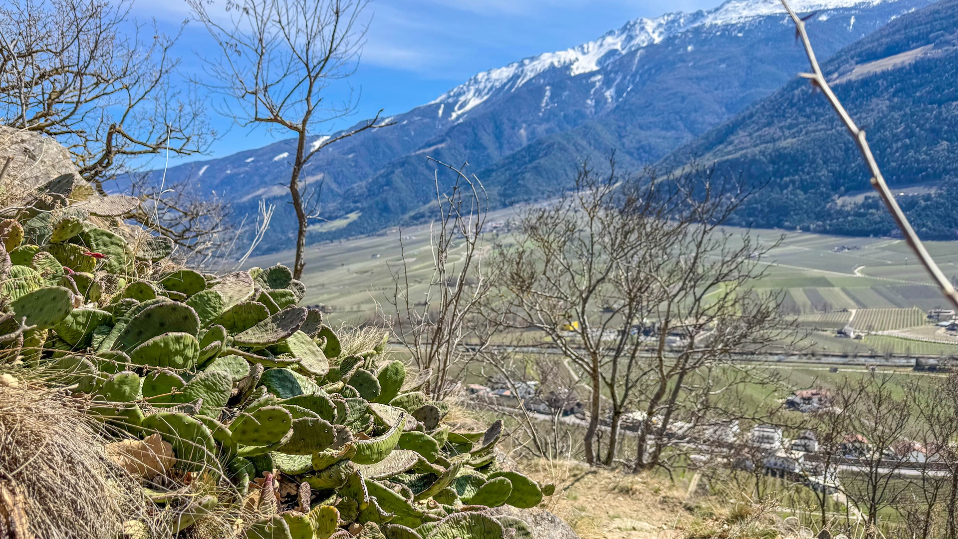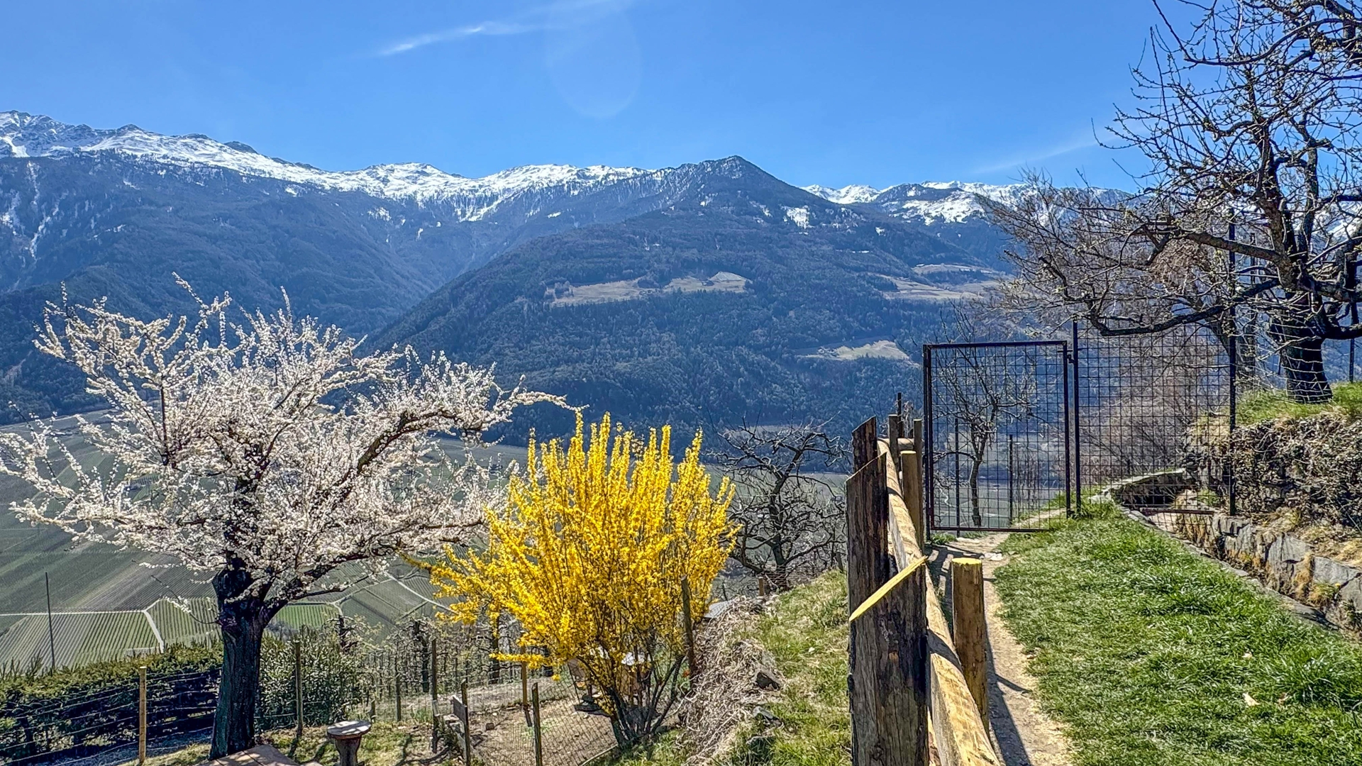 Das Highlight im April: Während im Tal ein weißes Meer aus Apfelblüten leuchtet, blühen am sonnenverwöhnten Hang sogar echte Kakteen. Begleitet vom entspannten Rauschen historischer Waalwege wandern wir auf dem „Via Vinum Venostis" zu einer gemütlichen Einkehr im Hofschank.